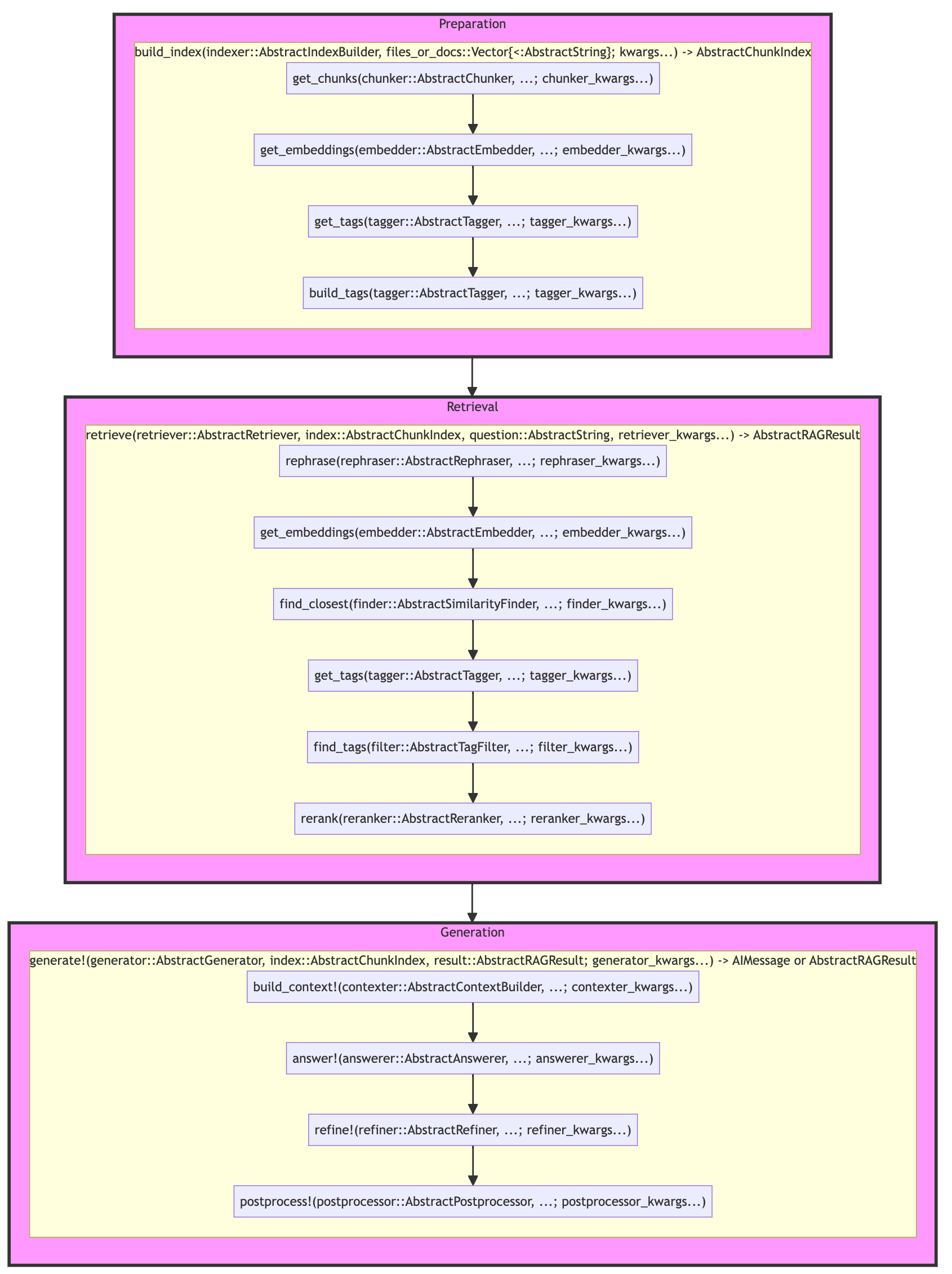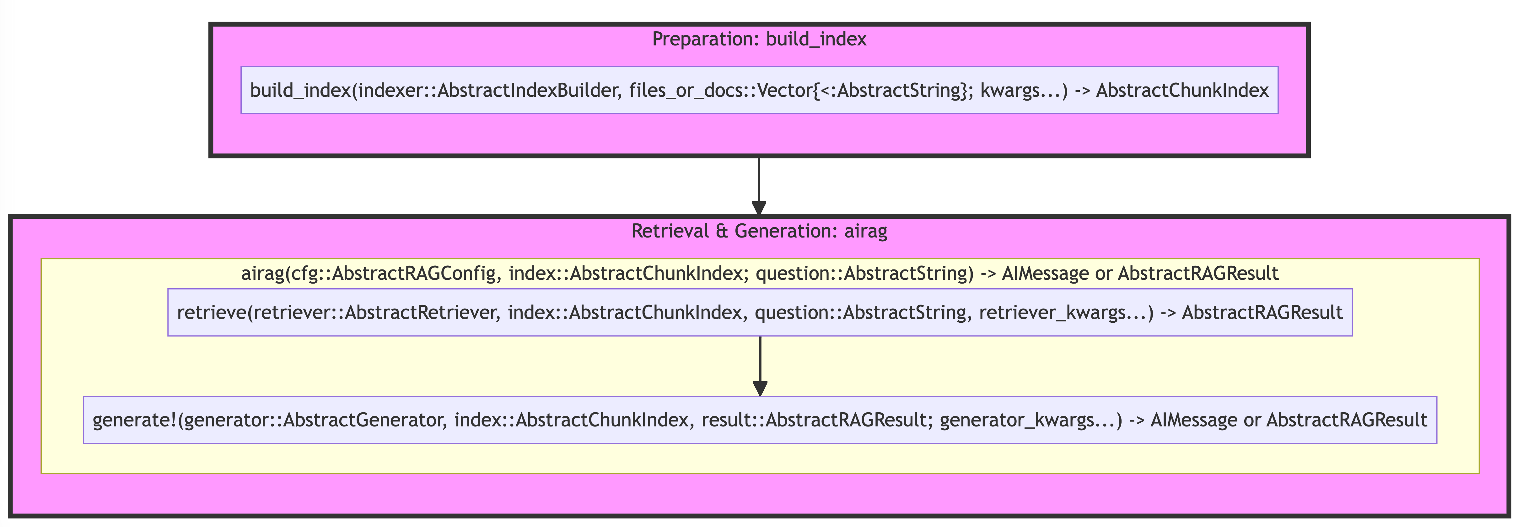 The corresponding functions are build_index, retrieve, and generate!, respectively. Here is the high-level diagram that shows the signature of the main functions: